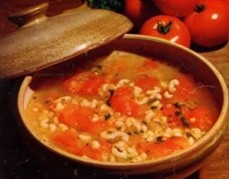 Dorate in olio d'oliva l'aglio, i pomodori passati, le cipolle affettate, il prezzemolo e coprite con acqua. Cuocete la pasta. 10 minuti prima di servire aggiungete alla salsa, la pasta e il prezzemolo. Servite cospargendo di parmigiano.