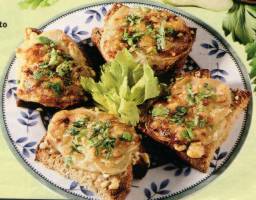 Distribuite sopra le fette di pane, il pecorino mescolato all'emmental; sopra questo sistemateci le pere sbucciate e tagliate a fettine e terminate di nuovo con i due formaggi. Infornate i crostini e lasciate gratinare per qualche minuto fino a che il formaggio inizierà a dorare e a fondere. Servite tritando sulla superficie il sedano.