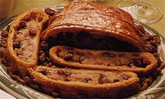 Sbucciate le mele, tagliatele a pezzetti, mescolateci le noci tritate, l'uvetta, i pinoli, lo zucchero, la buccia del limone grattugiata ed un pizzico di cannella; lasciate riposare per 20 minuti. Spianate la sfoglia sottilmente, sistemateci sopra il composto e arrotolate formando uno strudel. Mettetelo in una teglia da forno imburrata e infarinata, spennellate la superficie dello strudel con il tuorlo sbattuto ed un po' di burro sciolto. Cospargete con lo zucchero a velo e infornate a 200° per 40 minuti.