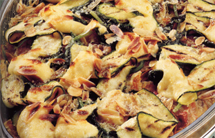 Rosolate la pancetta; sbollentate le foglie di cavolo, scolatele e fatele asciugare su carta casa. Fate lo stesso anche con gli spinaci dopo averli lavati molto bene. Grigliate le zucchine a fettine sottili; trifolate i funghi a fettine sottili con 1 spicchio d'aglio tritato e l'olio. Salate e pepate il tutto. Fate una besciamella mescolando sul fuoco il latte con 25 gr.di burro e la farina; quando sarà pronta, prima di toglierla dal fuoco, unite i tuorli e la fontina a cubetti. Stendetene uno strato sul fondo di una pirofila, sistemateci sopra le verdure a strati e la pancetta cospargendo ogni strato con le mandorle, la besciamella e il parmigiano; continuate così fino alla fine degli ingredienti. Spolverate poi la superficie con abbondanti mandorle, parmigiano e noci di burro; infornate a 180° per 1 ora.
