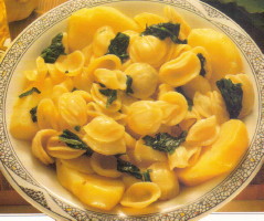 Sbucciate le patate e tagliatele a fettine spesse; lessatele in acqua salata con la rucola. Dopo che avranno bollito per 5 minuti uniteci anche la pasta e lasciate cuocere mescolando. Rosolate nel frattempo a fuoco basso, l'olio con l'aglio schiacciato e il peperoncino mescolando. Quando la pasta con le verdure saranno cotte, scolatele, conditele con il soffritto appena fatto e servite.